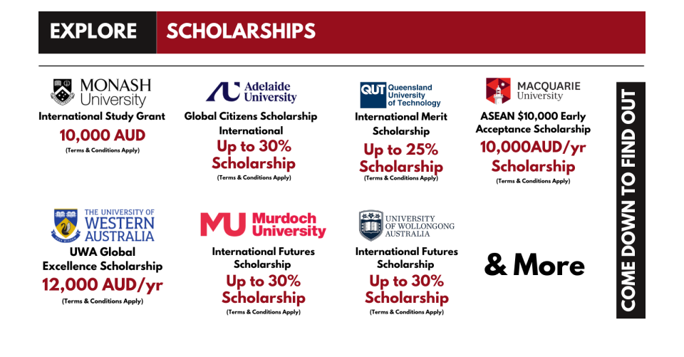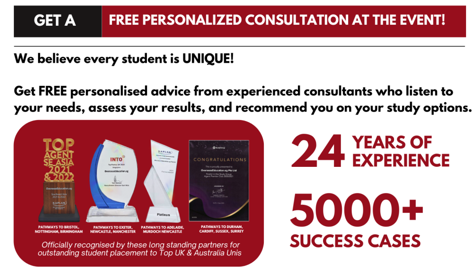 We are officially appointed by universities to represent them in Singapore, so they cover all costs. You can get expert advice on applications, visas, accommodation, scholarships, and more—at no cost to you.