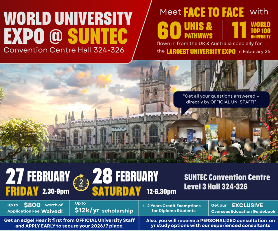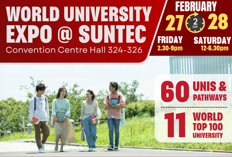 Keen to Study Overseas? Join our World University Expo Friday-Saturday 27-28 Feb at Suntec Convention Centre Level 3 Hall 324-326 where you can meet staff members of Renown Unis & Pathways from the UK & Australia, etc. (Many travel from overseas for this event). Fantastic One-Stop Event for you to get all your queries answered and get an in-depth understanding of many Renowned Unis & Pathways.
