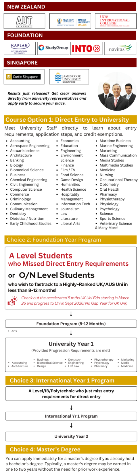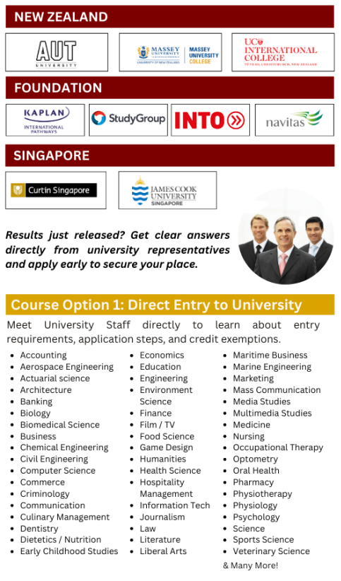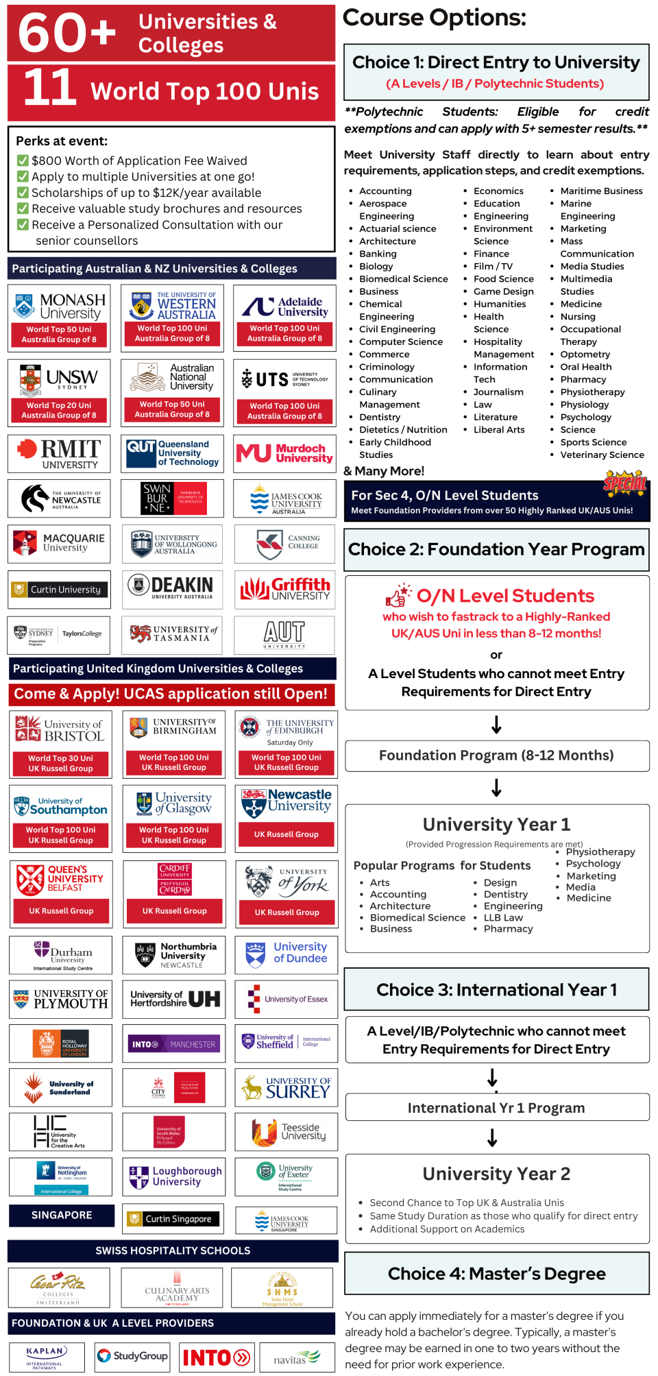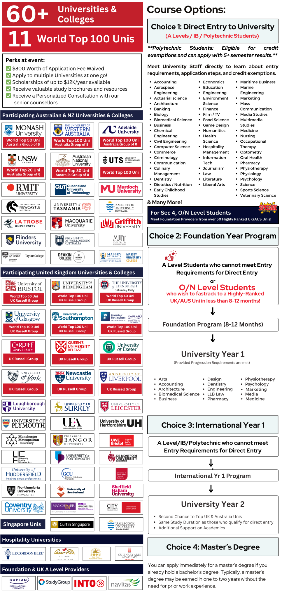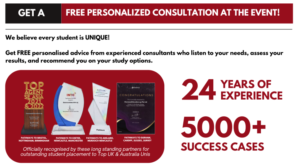 Keen to Study Overseas? Join our World University Expo on Friday, 27 Feb & Sat, 28 Feb at Suntec Convention Centre Level 3 Hall 324-326 where you can meet staff members of Renown Unis & Pathways from the UK & Australia, etc. (Many travel from overseas for this event). Fantastic One-Stop Event for you to get all your queries answered and get an in-depth understanding of many Renowned Unis & Pathways.