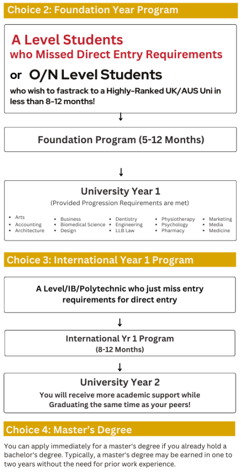 With over 20 years of experience and > 1,000 students successfully placed in top overseas universities, our expert education advisors are well-equipped to reccomend you the most suitable course and university based on your academic background, interests, and career goals. We also provide valuable brochures, university guides, and course details to help you make an informed decision—with full support every step of the way.